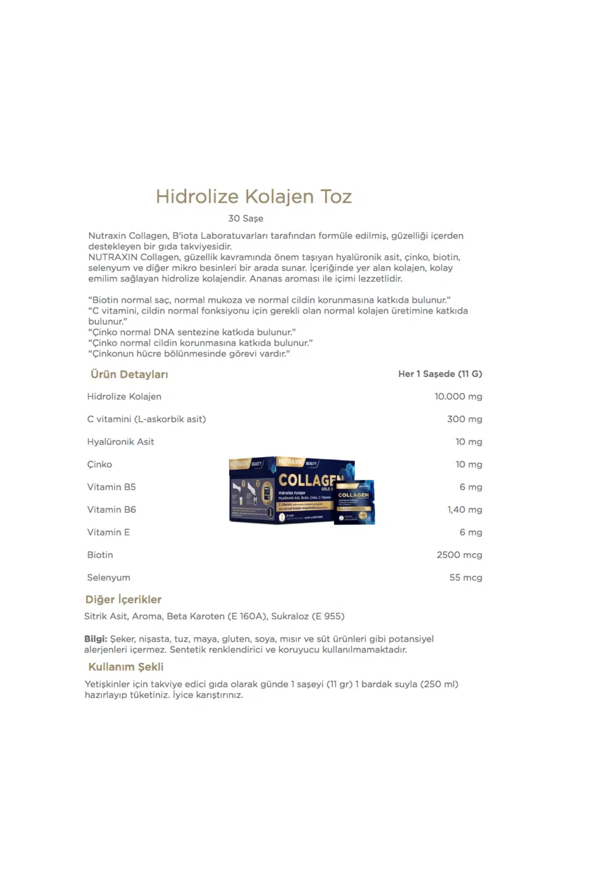 Hidrolize Kolajen Toz 30 Saşe:Nutraxin Collagen, B’iota Laboratuvarları tarafından formüle edilmiş, güzelliği içerden destekleyen bir gıda takviyesidir. NUTRAXIN Collagen, güzellik kavramında önem taşıyan hyalüronik asit, çinko, biotin, selenyum ve diğer mikro besinleri bir arada sunar. İçeriğinde yer alan kolajen, kolay emilim sağlayan hidrolize kolajendir. Ananas aroması ile içimi lezzetlidir.Kullanım Şekli:Yetişkinler için takviye edici gıda olarak günde 1 saşeyi (11 gr) 1 bardak suyla (250 ml) hazırlayıp tüketiniz. İyice karıştırınız. ----------------------- "Nutraxin Folic Acid 400 mcg 100 Tablet: Nutraxin Folic Acid