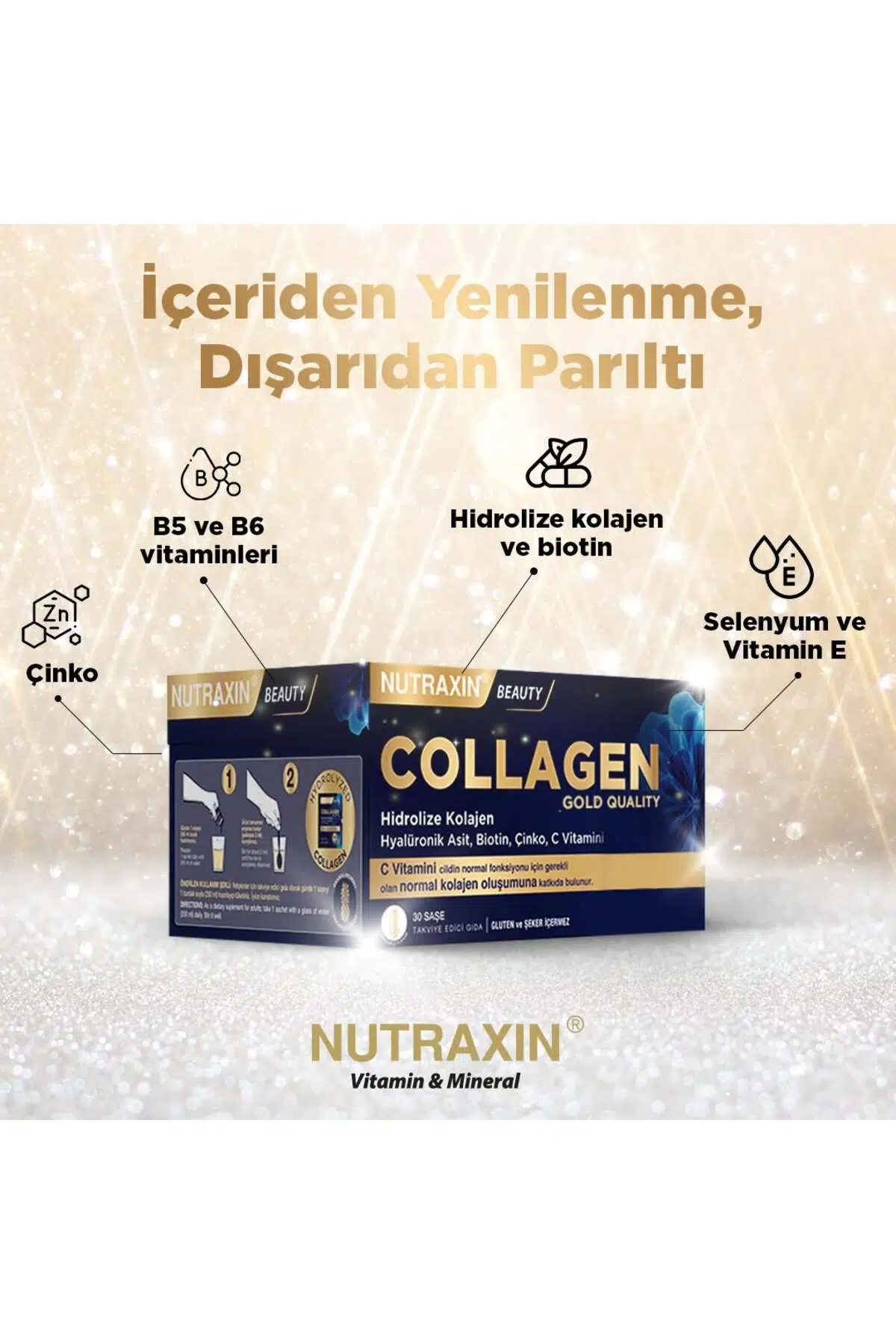 Nutraxin Collagen Gold Quality Ananas Aromalı Takviye Edici Gıda 30 Saşe Paket İçeriği:30 SaşeÖzet Bilgi:Ananas aromalı takviye edici gıda.Ürün Faydaları:Her 1 Saşede (11 GR) Hyalüronik asit, çinko, biotin, selenyum ve diğer mikro besinleri bir arada sunar.hyalüronik asit, çinko, biotin, selenyum ve diğer mikro besinleri bir arada sunar. Kullanım Şekli:Yetişkinler için takviye edici gıda olarak günde 1 saşeyi (11 gr) 1 bardak suyla (250 ml) hazırlayıp tüketiniz. İyice karıştırınız.Ürün Bileşimi:Sitrik Asit, Aroma, Beta Karoten (E 160A), Sukraloz (E 955)
